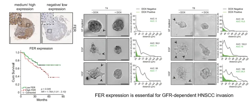 Fig. 1. FER is highly expressed in HNSCC and affects prognosis; knockdown of FER suppresses tumor cell invasion in an organoid model.